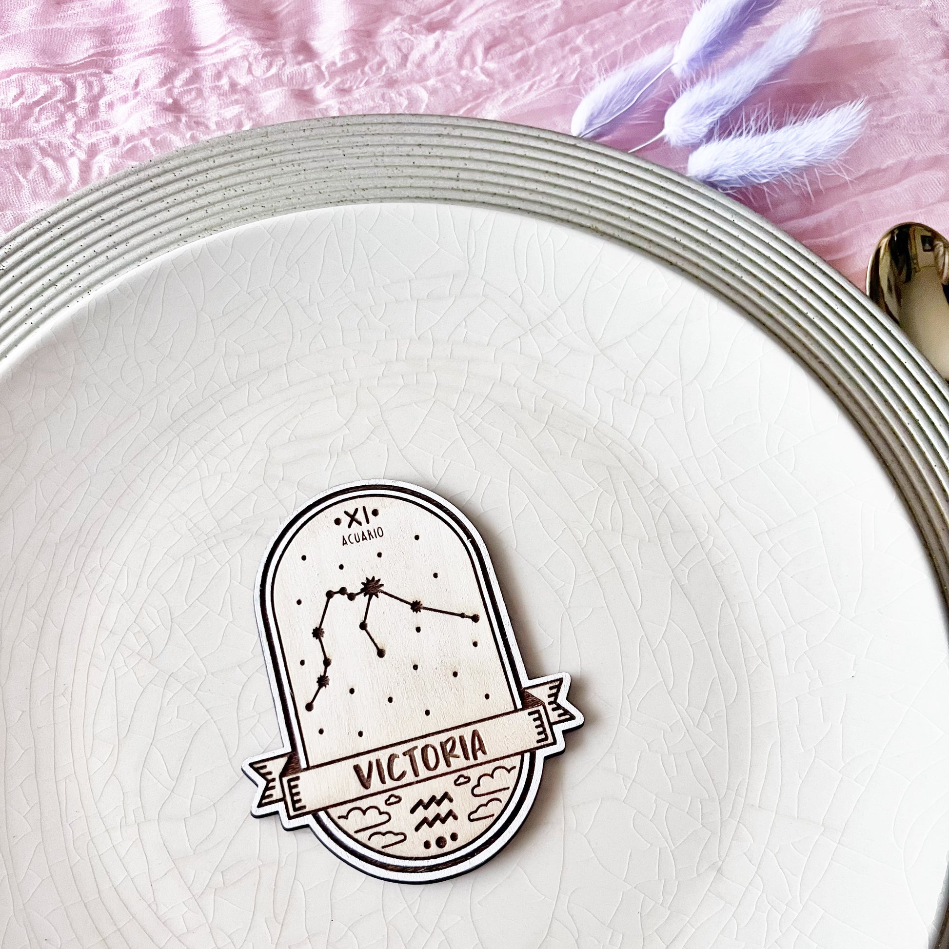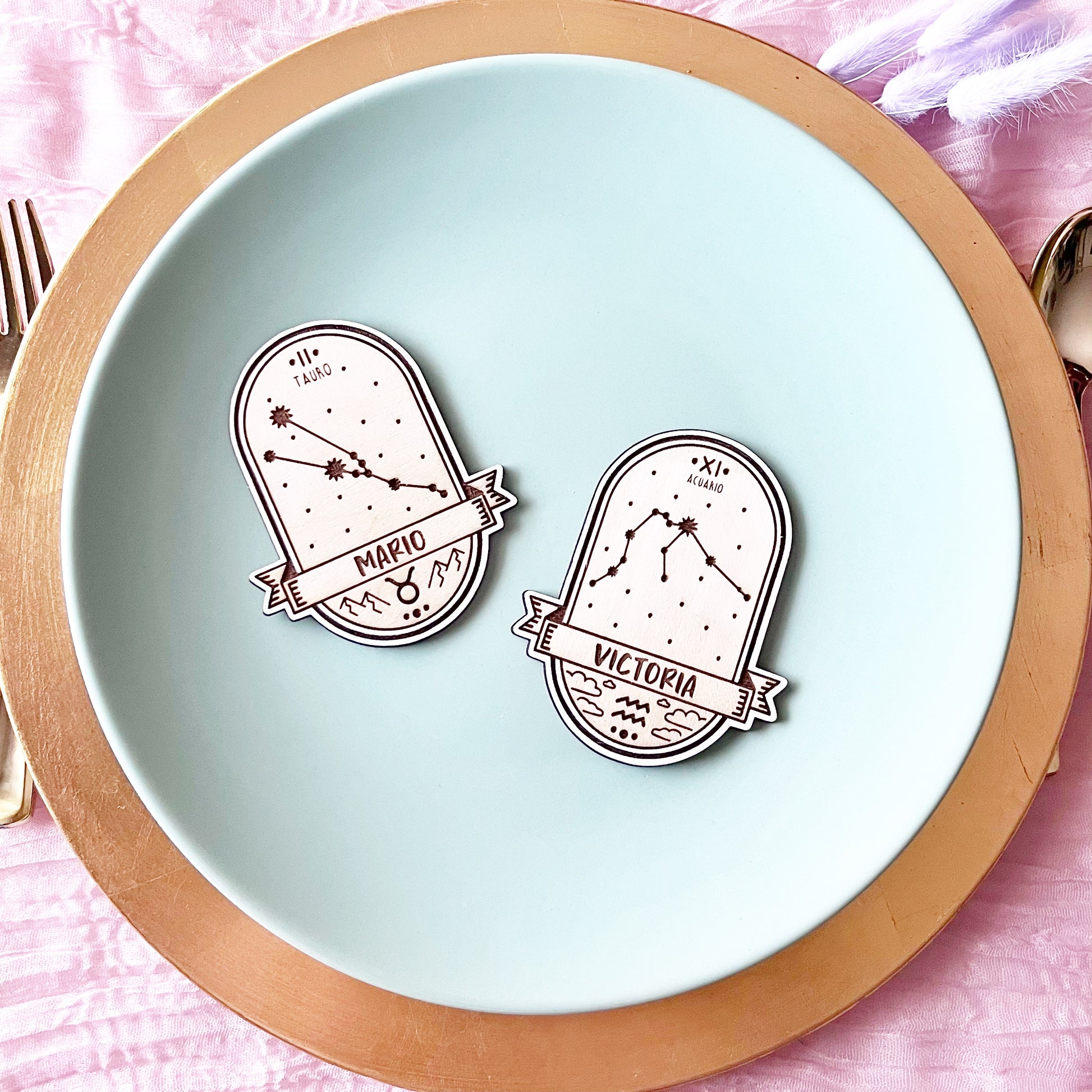 Cada uno se personaliza con el signo zodiacal, su símbolo, la constelación, el elemento y el nombre de cada invitado. Un recuerdo original y mágico que también podrán usar como imán decorativo.