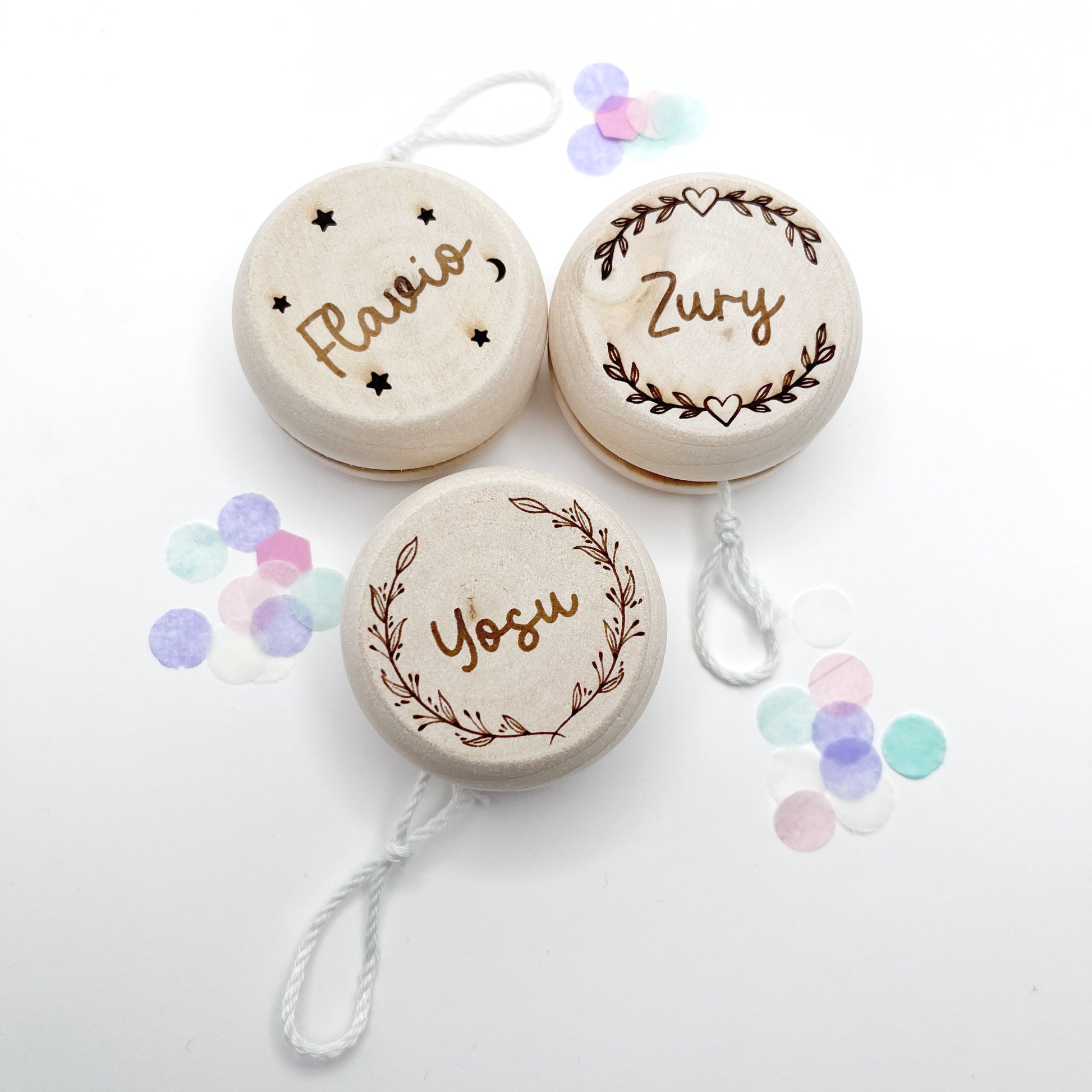 Estos yoyós de madera grabados con láser son perfectos para sorprender a tus invitados (niños y no tan niños) con un detalle diferente y entretenido.